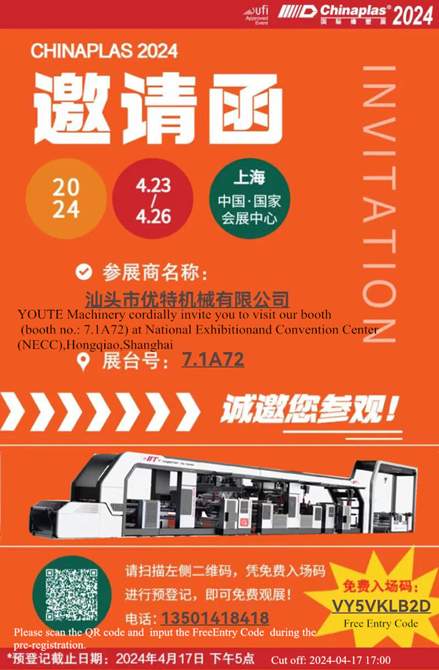 YOUTE Machinery cordially invite you to visit CHINAPLAS 2024