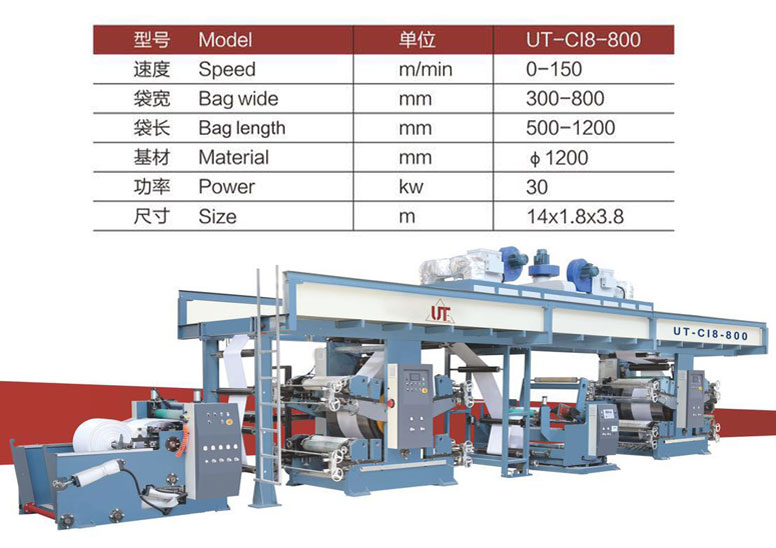 FEATURES : Central drum surrounded by numbers of printing station to have central impress printing . Stable tension , simple structure Better printing accuracy , less color differen . richer color and shading . Roll to roll continuous printing . Image printing on pp woven bags.